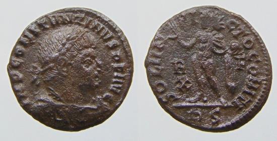 Constantine I. A.D. 307/10-337. Æ follis (17 mm, 3,27 g). Rome, A.D. 314/5. IMP CONSTANTINVS P F AVG, laureate, draped and cuirassed bust of Constantine I right / SOLI INVICTO COMITI, Sol standing left, raising right hand and holding globe; R/X-F//RP. RIC 27.
