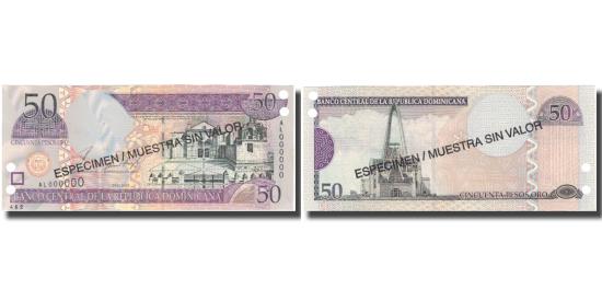 | | Banknote, Dominican Republic, 50 Pesos Oro, 2002, 2002, Specimen, KM:170a | | | 2001., Santa Maria la Menor Cathedral at right. Wide border printing at upper center right., Basilica de Nuestra Se<nt>ora de la Altagracia at left., Purple and dark brown on multicolor underprint. | | FEATURES |