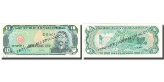 | | Banknote, Dominican Republic, 10 Pesos Oro, 1998, 1998, Specimen, KM:153s | | | Specimen with black overprint: ESPECIMEN / MUESTRA SIN VALOR once on each side. Punch hole cancelled., Mella at right, medallic Liberty head at center. Date under orange bank seal at left. Silver leaf-like underlays at left and right., Quarry mining scene, dates in upper margin., Deep green and black on multicolor underprint. | | FEATURES |