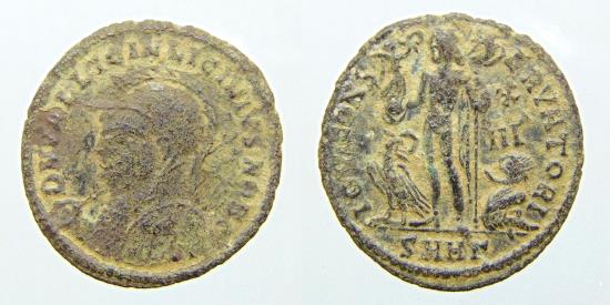 | Licinius II (Caesar, 317-324). Æ Follis (18mm, 2,67g). Heraclea, 321-324. Helmeted and cuirassed bust l., holding spear over shoulder and shield. R/ Jupiter standing l., holding Victory standing r. on globe and holding wreath, and sceptre; eagle standing l. at feet, head reverted, holding wreath in beak; bound captive seated r. at feet, head reverted; X/II?//SMH?. RIC VII 54. Brown patina, near EF |