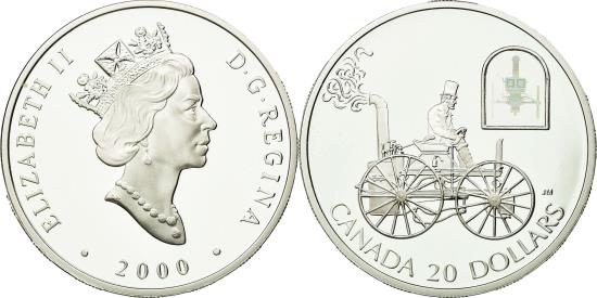 | | Coin, Canada, Elizabeth II, 20 Dollars, 2000, Royal Canadian Mint, Ottawa | | | Crowned head right, date below, Car below multicolored cameo, denomination below | | FEATURES |