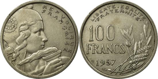 | | Coin, France, Cochet, 100 Francs, 1957, , Copper-nickel, KM:919.1 | | | Cochet, Liberty bust with torch right, Denomination above date at left, grain sprigs at right | | FEATURES |