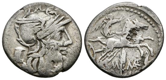 M. MARCIUS MN F. AG, Denarius. 134 BC. Rome mint. COUNTERMARK. Victory in biga right, M MARC / RO - MA.