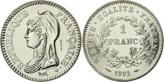 | | Coin, France, République, Franc, 1992, Paris, ESSAI, , Nickel | | | République, Liberty bust left, Denomination within wreath, date below | | FEATURES |