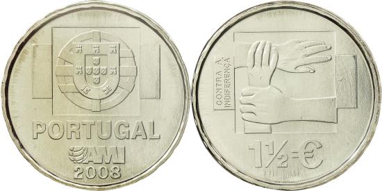 | | Portugal, 1-1/2 Euro, 2008, , Copper-nickel, KM:828a | | | National arms, AMI logo | | FEATURES |