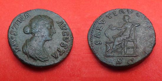 Rev.: SALVTI AVGVSTAE S C, Salus with Patera on Thron