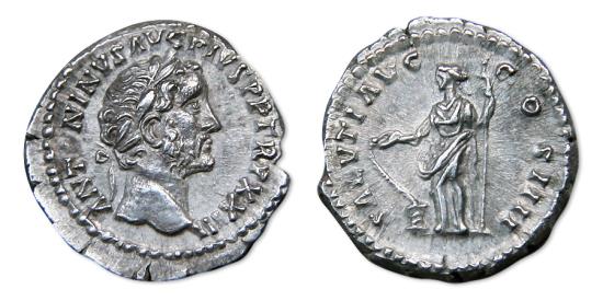 Antoninus Pius AR Denarius. AD 159-160 (18 mm, 3.2 g) ANTONINVS AVG PIVS PP TR P XXIII, laureate head right. SALVTI AVG COS IIII, Salus standing left, holding sceptre and feeding a serpent rising from altar at foot left. RIC 305, RSC 741, BMC 988. EF |