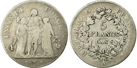 | | Coin, France, Union et Force, 5 Francs, AN 6, Paris, , Silver, KM:639.1 | | | Union et Force, Hercules group, Value within oak wreath, Dav. #1337., UNION ET FORCE <Bullet> * | | FEATURES |