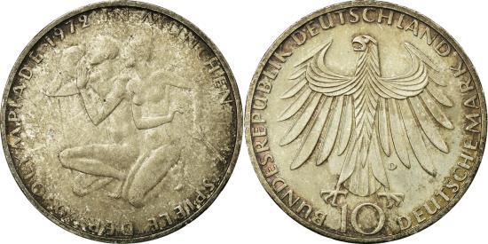 | | Coin, GERMANY - FEDERAL REPUBLIC, 10 Mark, 1972, Munich, , Silver | | | Eagle above denomination, Athletes kneeling, Issued 1971. | | FEATURES |