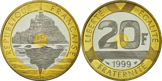 | | Coin, France, Mont Saint Michel, 20 Francs, 1999, Paris, | | | Mont Saint Michel, Mont St. Michel, Patterned denomination above date | | FEATURES |