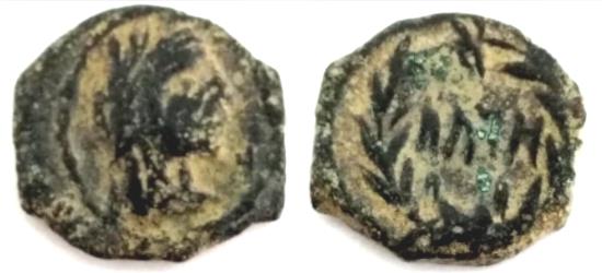 NABATAEA. Aretas IV. 9 BC-AD 40. Æ Quadrans (15.7 mm-2.0 g,). Struck AD 17-39. Laureate head right; Aramaic ḥēthto right / Legend within wreath.