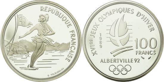 | | Coin, France, Patinage, 100 Francs, 1989, , Silver, KM:972, Gadoury:C3 | | | Ice Skating Couple, Cross on flame, date and denomination, logo below | | FEATURES |