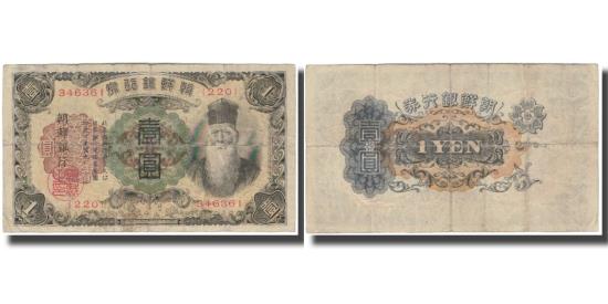 | | Banknote, Korea, 1 Yen, KM:29a, VF(20-25) | | | Issued note., Brown guilloche at left, green guilloche at center, man with beard at right. Serial # and block #. 14 character imprint., Without bank name in English., Black on light brown underprint. | | FEATURES |