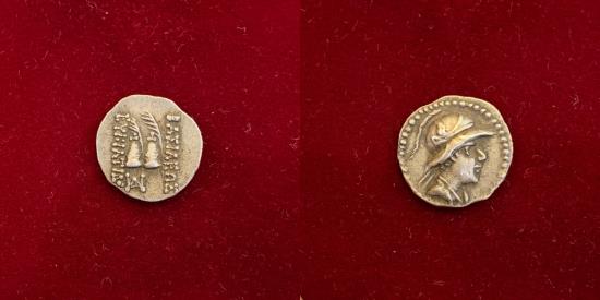 11.18mm, 0.68gm. Diademed, helmeted and draped bust right / Caps of the Dioskouroi and