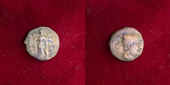 Baktria, Greco-Baktrian Kingdom. Diodotos II Theos. Circa 235-225 BC. AE Half Chalkous. 12.80mm, 1.26gm. Ai Khanoum (آي خانم), or Baktra mint. Head of Hermes right, wearing petasos / Athena standing facing, holding