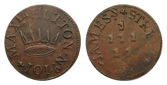 | 18th Century Token, Ireland, Dublin, undated copper Farthing, St James Street, Maximillian Hutton, a crown with hatched interior, legend surrounding, MAXL. HUTTON. No. 101+, outer beaded border surrounding, rev. six griffin head left, arranged horizontally 1 / 3/ 2 over a cross, legend around JAMESS.+ STREET, weight 3.75g (DH 396). Toned, weak in parts, good very fine. |