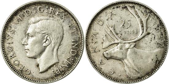| | Coin, Canada, George VI, 25 Cents, 1947, Royal Canadian Mint, Ottawa, | | | Head left, Caribou left, denomination above, date at right, Dot After 7, T. H. Paget | | FEATURES |