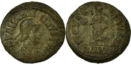 | | Coin, Valentinian II, Nummus, AD 383-384, Siscia, , Copper, RIC:39 | | | Diademed head right, Victoria walking left, D N VALENTINIANVS P F AVG, VICTORIA AVGGG // BSIS | | FEATURES |