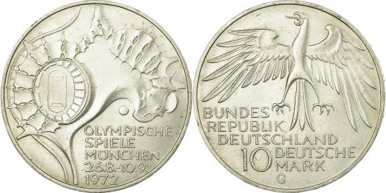 | | Coin, GERMANY - FEDERAL REPUBLIC, 10 Mark, 1972, Karlsruhe, , Silver | | | Eagle above denomination, Stadium - aerial view | | FEATURES |