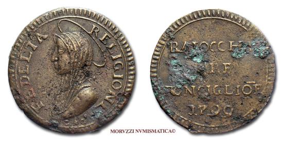 | Ronciglione / Рончильоне, Austrian occupation / Österreichische Besetzung / Австрийская оккупация / Oostenrijkse bezetting / Ocupación austriaca / Occupation autrichienne / OCCUPAZIONE AUSTRIACA, 1799-1800, MADONNINA DA 3 BAIOCCHI / 3 Байокко / 3 Bajocchi, Issue: 1799, Zecca di Ronciglione / Mint of Ronciglione (Рончильоне), Rif. bibl. / References: Pagani, 2625; Berman, 3216; Metal: CU / Copper / Kupfer / Медь / Koper / Cobre / Cuivre, Weight: gr. 15,84, (MX116300), Diam.: mm. 31,67, qBB / near VF (40/70), (RR) |