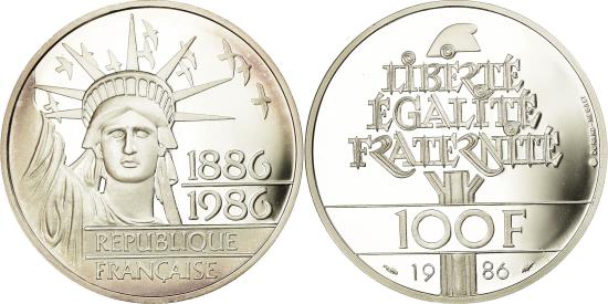 | | Coin, France, Statue de la Liberté, 100 Francs, 1985, BE, , Silver | | | Top of statue facing, Liberty cap over inscription above denomination, date below | | FEATURES |