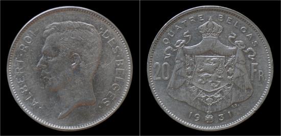 Belgium Albert I 20 frank (4belga) 1931FR-pos B
