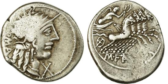 | | Coin, Fannia, Denarius, Rome, , Silver, Crawford:275/1 | | | M. Fannius, Fannia, Denarius, Rome, 123 BC, Silver, Crawford:275/1, Helmeted head of Roma right; ROMA behind, X (mark of value) below chin, Victory driving galloping quadriga right, holding reins and wreath, ROMA, M. FAN. C. F. | | FEATURES |