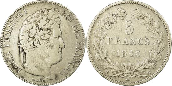 | | Coin, France, Louis-Philippe, 5 Francs, 1843, Lille, , Silver | | | Louis-Philippe, Laureate head right, Mint marks at edge outside wreath | | FEATURES |