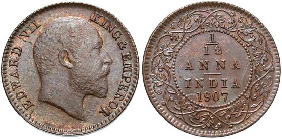 India, British. 1907. 1/12 Anna (17 mm, 1.65 g).