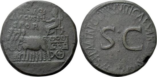Obv: DIVO / AVGVSTO / S P Q R. Augustus, holding branch and sceptre, seated left in quadriga of elephants, each driven by mahut. Rev: TI CAESAR DIVI AVG F AVGVST P M TR POT XXXVI. Legend around large S • C.