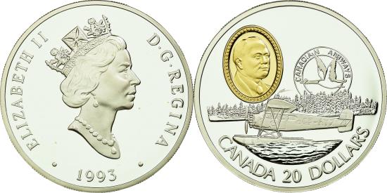 | | Coin, Canada, Elizabeth II, 20 Dollars, 1993, Royal Canadian Mint, Ottawa | | | Crowned head right, date below, Fairchild 71C float plane, James A. Richardson, Sr. in cameo, denomination below | | FEATURES |