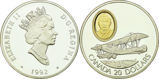 | | #[734994] COIN, CANADA, ELIZABETH II, 20 DOLLARS, 1992, ROYAL CANADIAN MINT, OTTAWA | | | Crowned head right, date below | | Curtiss JN-4 Canick (Jenny), Sir Frank W. Baillie in cameo, denomination below | | CHARACTERISTICS |