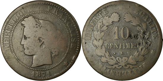 | | Coin, France, Cérès, 10 Centimes, 1871, Bordeaux, , Bronze, KM:815.2 | | | Cérès, Laureate head left, Denomination within wreath | | FEATURES |