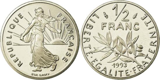 | | Coin, France, Semeuse, 1/2 Franc, 1993, Paris, Proof, , Nickel | | | Semeuse, Modified sower, engraver's signature: O. ROTY preceded by D'AP, Laurel divides date and denomination | | FEATURES |