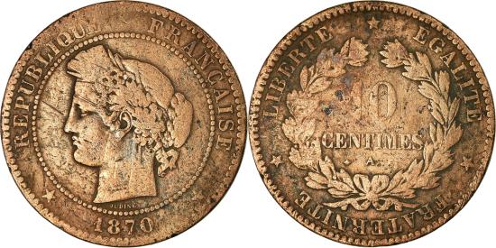 | | Coin, France, Cérès, 10 Centimes, 1870, Paris, Petit A, , Bronze | | | Cérès, Laureate head left, Denomination within wreath | | FEATURES |