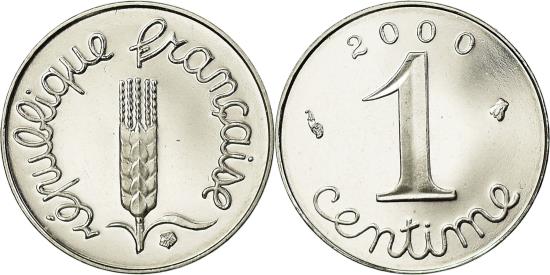 | | Coin, France, Épi, Centime, 2000, Paris, Proof, , Stainless Steel | | | Épi, Cursive legend surrounds grain sprig, Cursive denomination, date at top, 1991-1993 dated coins, non-Proof, exist in both coin and medal alignment. Values given here are for medal alignment examples. Pieces struck in coin alignment have been traded for as much as $50.00. | | FEATURES |