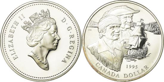 | | Coin, Canada, Elizabeth II, Dollar, 1995, Royal Canadian Mint, Ottawa, Proof | | | Crowned head right, Explorers and ship, date and denomination below | | FEATURES |