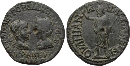 Obv: AYT K M ANT ΓΟΡΔΙΑΝΟC AVΓ CAB TRANKVΛΛEINA, Confronted draped busts of Gordian, laureate, and Tranquillina. Rev: OYLΠIANWN AΓXIALEΩN, Serapis standing left, raising hand and holding sceptre.