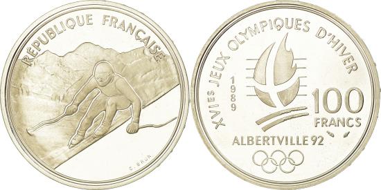 | | Coin, France, Alpine skiing, 100 Francs, 1989, BE, , Silver, KM:971 | | | Alpine skiing, Cross on flame, date and denomination, logo below | | FEATURES |