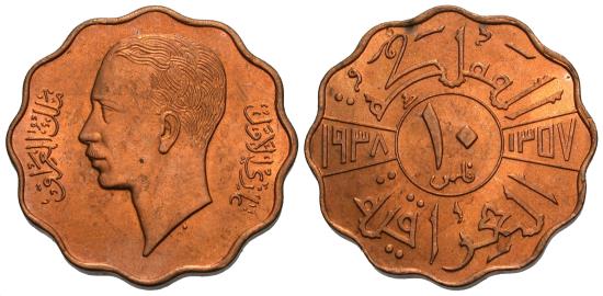 Iraq. Ghazi I. 1938. 10 fils. Choice Unc., bronze issue.