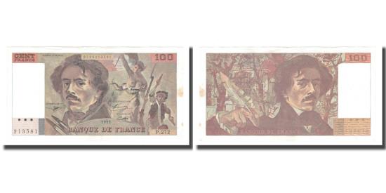 | | France, 100 Francs, Delacroix, 1995, AU(50-53), Fayette:69ter.02b, KM:154h | | | Signature as g. New Ley (law) on back. 1994; 1995., Eug<e>ne Delacroix at left center. Marianne holding tricolor, park of Delacroix's painting La Liberté Guident le Peuple at right. Like #153 but 100 CENT FRANCS retouched with heavier diagonal lines at upper left., Delacroix at right holding quill pen., Brown. | | FEATURES |
