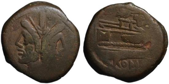 Anonymous Æ As (31mm, 21.45 g.) Reduced Sextantal standard. Rome mint, 169-158 BC Obv. Laureate head of bearded Janus; I (mark of value) above. Rev. Prow of galley right, above butterfly on vine branch with leaf and grape bunch. Crawford 184 (citing 20 specimens) About VF, Greenish-brown patina. Very scarce. |