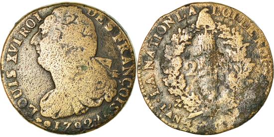 | | Coin, France, 2 sols françois, 2 Sols, 1792, Paris, , Bronze | | | 2 sols françois, Bust left, Liberty cap above fasces, oak wreath in background, LOUIS XVI ROI DES FRANCOIS <Bullet> | | FEATURES |