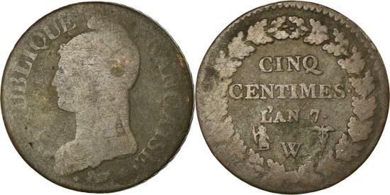 | | Coin, France, Dupré, 5 Centimes, 1798, Lille, , Bronze, KM:640.11 | | | Dupré, Liberty head left, Value within oak wreath, REPUBLIQUE FRANCAISE <Bullet> * | | FEATURES |