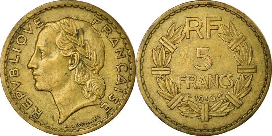| | Coin, France, Lavrillier, 5 Francs, 1945, Castelsarrasin, | | | Lavrillier, Laureate head left, Denomination above date within sectioned wreath | | FEATURES |