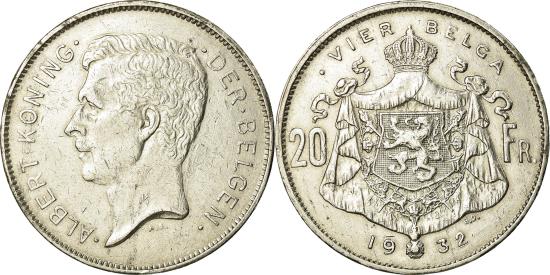 | | Coin, Belgium, 20 Francs, 20 Frank, 1932, , Nickel, KM:102 | | | Legend in Dutch, All dates exist in position A and B, values are the same., DER BELGEN | | FEATURES |