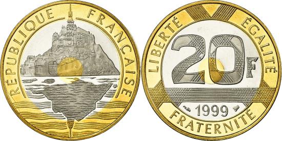 | | Coin, France, Mont Saint Michel, 20 Francs, 1999, Paris, Proof, | | | Mont Saint Michel, Mont St. Michel, Patterned denomination above date | | FEATURES |