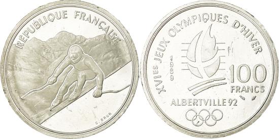 | | Coin, France, Alpine skiing, 100 Francs, 1989, BE, , Silver, KM:971 | | | Alpine skiing, Cross on flame, date and denomination, logo below | | FEATURES |