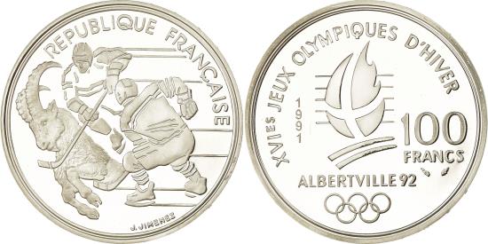 | | Coin, France, Hockey players, 100 Francs, 1991, BE, , Silver, KM:993 | | | Hockey players and Ibex, Crossed flame divides date and denomination, Olympic logo below | | FEATURES |