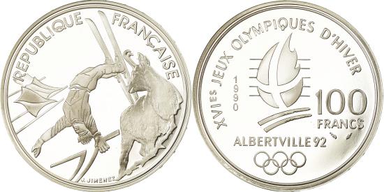| | Coin, France, Free-style skier, 100 Francs, 1990, BE, , Silver, KM:983 | | | Free-style skier and chamois, Crossed flame, date and denomination, logo below | | FEATURES |